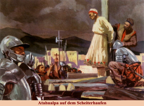 Atahualpa auf dem Scheiterhaufen "Was habe ich nur verbrochen?", fragte der Herrscher der Inka, als ihm die Spanier den Prozeß machten. Er bekam von Pizarro keine Antwort. Man führte ihn gefesselt zum Scheiterhaufen. Schon an den Pfahl gebunden, versuchte er, dem sicheren Flammentod dadurch zu entgehen, daß er sich taufen ließ. Aber das rettete ihn nicht. |