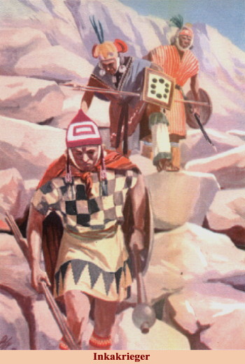 Inkakrieger Vorsichtig steigen diese drei Inkakrieger von den Bergen herab. Sie wollen ihr Land gegen die spanischen Eroberer verteidigen. Sie sind gut bewaffnet mit Speeren und Keulen, und im Nahkampf schützen sie sich mit den kleinen, harten Schilden. Aber gegen die Feuerwaffen der Spanier konnten sie nicht viel ausrichten, und so zogen die Inkakrieger in eine Schlacht, die von vornherein verloren war. |