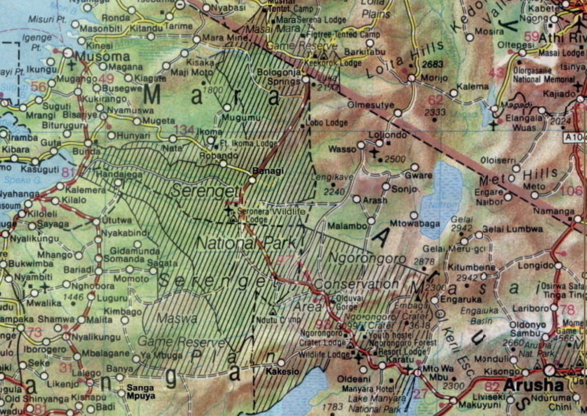 Ausschnit aus einer Landkarte für Ngorongoro Conservation Area in Tansania |